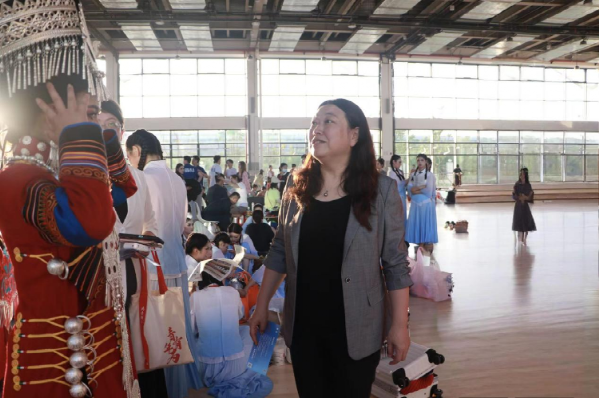 开幕式前,学校党委常委、副校长张炜前往排练场地看望慰问参演师生。张炜热情地与师生们交流,并指导参加入场式表演的同学们动作细节。她对参演师生的训练成果和积极备赛的状态给予了充分肯定,鼓励大家全力以赴,用真心点亮“大艺展”的舞台。