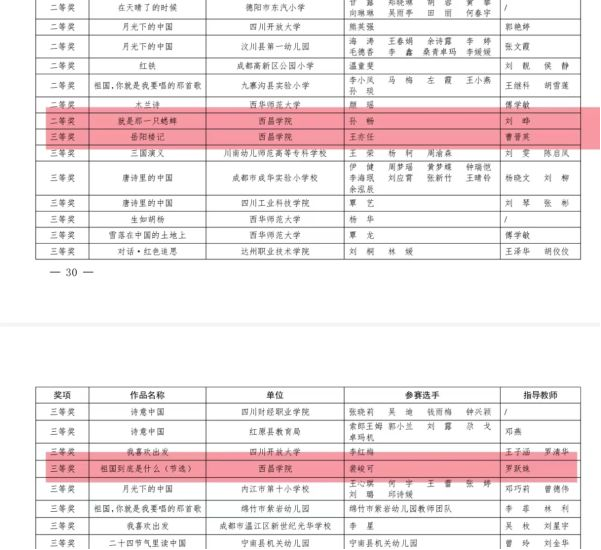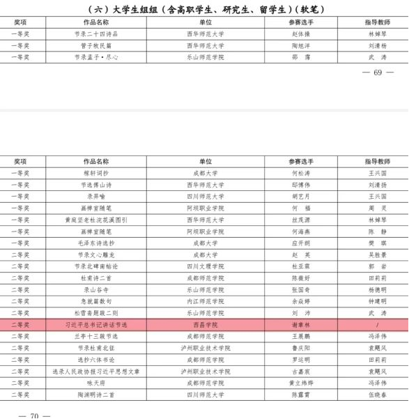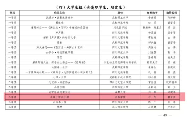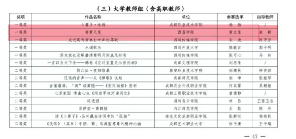 2月10日,经学校语委精心组织,我校在由中共四川省委宣传部、中共四川省委教育工作委员会、四川省教育厅、四川省语言文字工作委员会联合主办的“四川省2024年中华经典诵写讲演”系列活动中取得优异成绩,获得7项奖项。同时,在全国第六届中华经典诵写讲大赛中,文化传媒学院黄立佳老师获得了国赛三等奖。