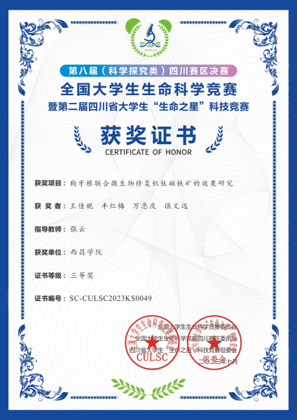 3、2023年7月,指导2020级王佳妮团队获全国大学生生命科学竞赛暨第二届四川省大学生“生命之星”科技竞赛三等奖(狗牙根联合微生物修复钒钛磁铁矿的效果研究);【省级,三等奖】