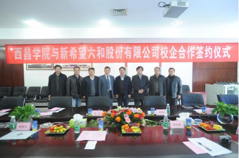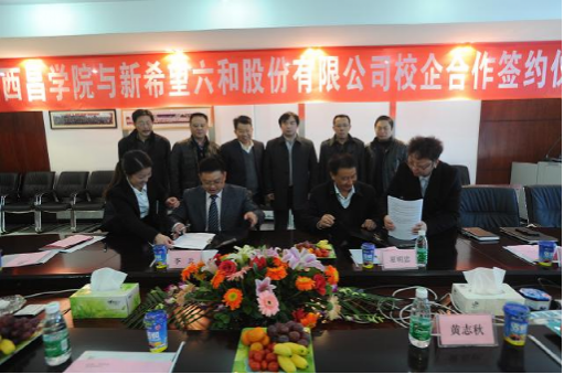2013年12月5日11︰00,在新希望六和股份有限公司(新希望集团是公司最大股东,股票代码000876,控股的分、子公司500余家,业务遍及全国并在多个国家建立了分、子公司)成都中心三楼会议室,西昌学院夏明忠院长与新希望六合股份公司副总裁、成都中心总裁李兵签订了《校企合作订单式人才培养协议》。西昌学院夏明忠校长,教务处胡青龙处长、赵益强副处长,动物科学学院黄志秋副院长;新希望六合股份公司副总裁、成都中心总裁李兵,成都中心饲料管理部朱黎强总经理,成都中心养殖事业部龚华忠总经理,三台希望农牧有限公司刘忠总经理,成都中心人力资源部总经理助理王森琳、招聘高级经理罗艳红等参加了签约仪式,签约仪式由龚华忠总经理主持。