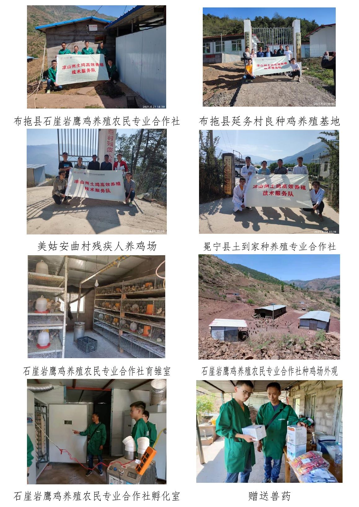为践行党史学习教育成果,助力地方产业发展,2021年4月21日——24日,我院王思芦博士带领动医专业学生党员刘凯、肖宁、李鹏程、余永浩等一行5人赴布拖县委只洛乡委只洛村、采哈乡延务村,美姑县尼哈乡安曲村,冕宁县沙坝镇农丰村、复兴镇巨龙社区等地开展了为期3天的土鸡无抗养殖技术志愿服务活动。