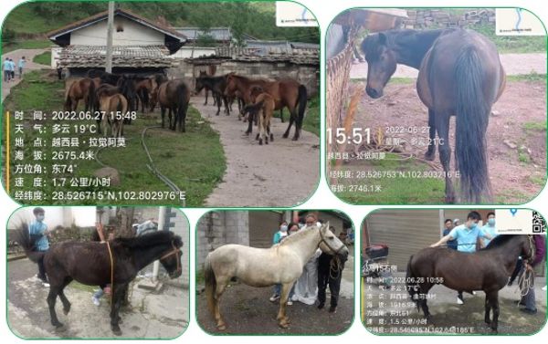 建昌马,产于古地名“建昌卫”(今西昌市)而得名,曾为贡马,又名为“蜀马”、“川马”。在清朝选举武生时,在“建昌卫”校场进行骑(建昌马)射比赛以选择人才。建昌马因其适应能力强,耐粗饲,体格中等,适应于川渝潮湿的山地环境。改革开放前,建昌马作为主要出行和役力工具的来源,为当地住民提供了大量的便利。随着工业化进程高飞猛进,建昌马的作用被机械化相继取代,现处于濒临灭绝的关键时期。按照要求,建昌马遗传资源普查工作团队成员分3个组分别对60头建昌马进行了颈静脉采血、体尺测定、体型外貌评定和影像采集,以期保护地方优良品种“建昌马”提供基础数据,旨在助推“马业”可持续的健康发展、完善马种业“芯片”和实现种业振兴提供数据支持。