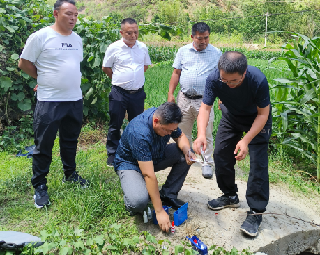 调研组来到金江村后,首先与镇长陈和兵,副镇长罗明浩、赵信等交流座谈,就牛蛙养殖基地品种选择、土地性质、流转政策等进行了交流。随后,一并前往即将开展牛蛙养殖的地块进行现场考察。在考察现场,三位老师对地块水温、Ph、氨氮、亚硝酸盐等指标进行了现场测定,并就地热水的利用、基地电源保障等进行了研判和分析。
