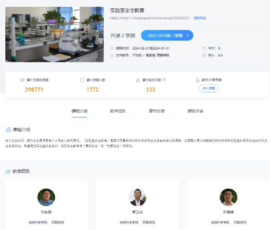 截止3月6日,学院已有1700余名同学选课,累计页面浏览量近 30 万次。本课程的开设,实现了学生安全培训全覆盖,很大程度上促进了实验室建设水平的提高,对保障实验实训室安全,促进师生由要我安全变我要安全,具有十分重要的意义。