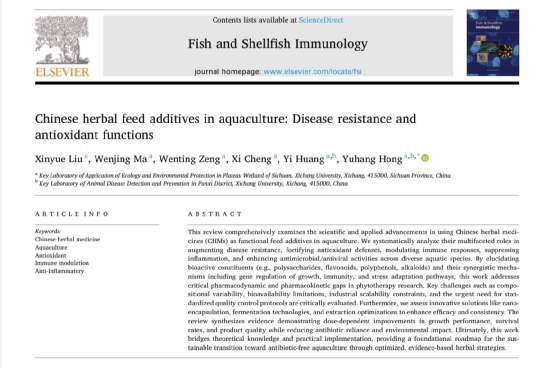 近日,我院2023级动物医学专业1班本科生刘欣悦以第一作者身份撰写的论文“Chinese herbal feed additives in aquaculture: Disease resistance and antioxidant functions”在国际知名学术期刊《Fish and ShellFish Immunology》(SCIE收录,中国科学院农林科学大类2区TOP,兽医学小类1区,5年IF=4.2)在线发表。水产养殖专业2024级曾文婷、2023级马文静参与其中。该论文得到了西昌学院攀登计划(117620023)和西昌市科技项目(18JSYJ13)的支持,论文通讯作者为动物科学学院教师洪宇航副教授。
