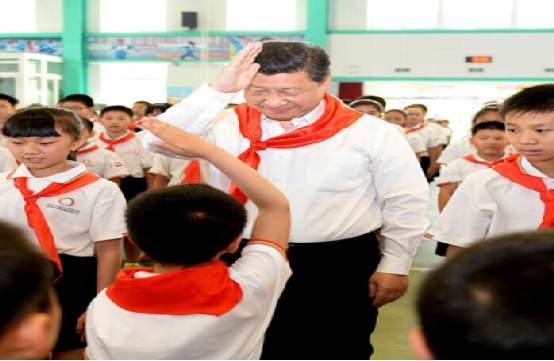 2014年“六一”前夕,习近平来到学校,同大家一起高唱《中国少年先锋队队歌》,给新少先队员戴上红领巾,还敬队礼祝贺。