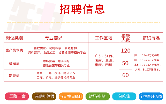 1 | 技术员 | 大专及以上 | 畜牧兽医、动物营养、饲料科学、水产养殖类专业 | 适应猪场、鸡场工作环境,接受封场管理 |