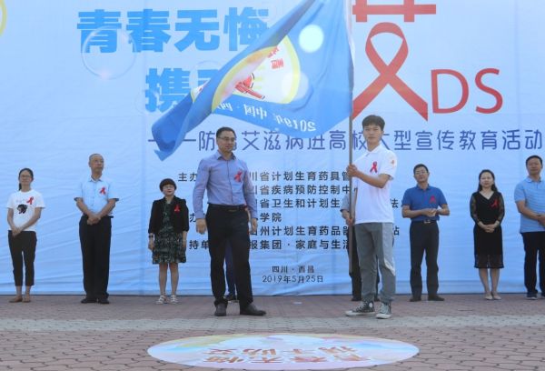 学生代表付明飞宣读活动倡议书,呼吁当代大学生认真学习艾滋病相关知识,提高预防艾滋病的意识;明确责任与义务,从自身做起,投身到预防艾滋病的宣传队伍中去;遵章守纪、洁身自爱,正确对待艾滋病。 四川省卫生健康委重传处副处长邓斌向西昌学院志愿者代表交接旗帜。