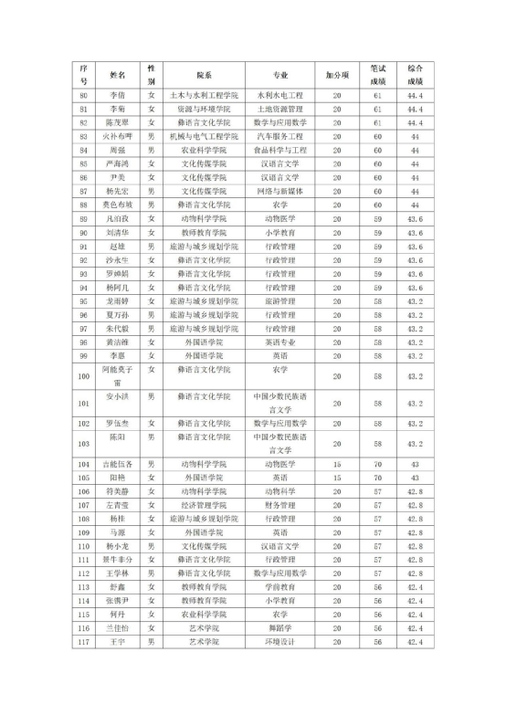根据四川省大学生志愿服务西部计划项目管理办公室《关于2023年四川省大学生志愿服务西部计划招募选拔相关工作安排的通知》(省目办发〔2023〕6号)文件要求,本次西昌学院大学生志愿服务西部计划志愿者招募考试应参加考试人数392人,实际参加考试人数338人,经研究决定,按照《关于2023年四川省大学生志愿服务西部计划招募选拔相关工作安排的通知》中明确的进入面试人数比例(即最终招募指标的3倍以上),根据加分项与笔试成绩之和确定前150名进入2023年西昌学院大学生志愿服务西部计划志愿者招募考试面试阶段,现将积分项、笔试成绩(按40%折算)及进入面试考生名单公布如下:     公示期为2023年5月29日-5月31日,如有任何异议,请在公示期间以书面形式或电话形式反映。 联系人:董华芳 联系电话:0834-2580080 邮箱:xcctw-tsjy@163.com 面试须知 一、面试时间:6月1日下午14:30-16:30 二、面试地点:安宁校区博远楼(第八教学楼) 三、注意事项:请考生带上身份证于6月1日14:00前在安宁校区博远楼报到。 |