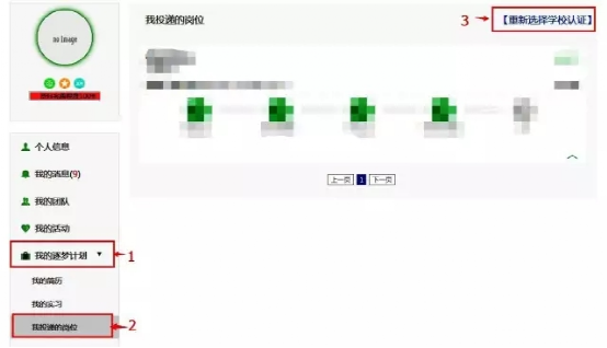 Step1:进入个人中心—我的逐梦计划—我投递的岗位 页面,点击页面右上角的【重新选择学校认证】。