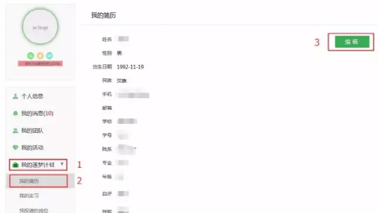 Step1:进入 个人中心—我的逐梦计划—我的简历 页面,点击页面右上角的【编辑】。