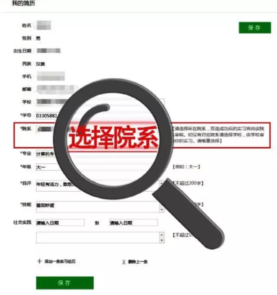 Step2:完善并保存简历。(注:请慎重选择选择所在院系,双选成功后的实习将由该院系审核。如没有对应院系请选择学校,由学校审核你的实习。)