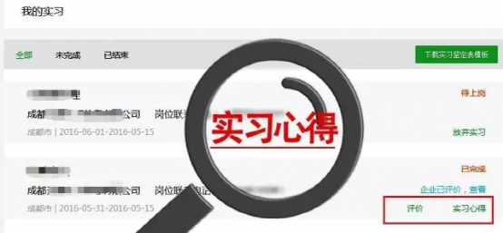 实习完成后,用人单位将实习状态置为 “实习完成” 。实习完成后学生和用人单位可以 互评 ,学生可以上传 实习心得 。