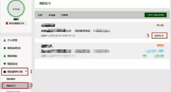 放弃实习步骤:在 个人中心—我的逐梦计划—我的实习 页面,点击该条岗位信息右下角的【放弃实习】按钮。