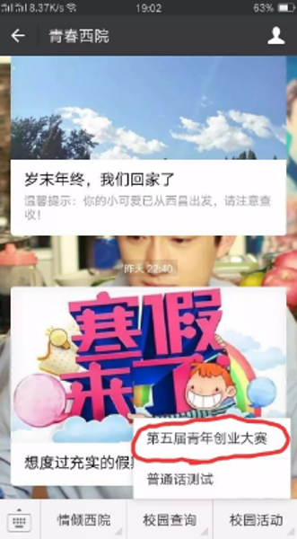 在“青春西院”公众号界面的菜单栏里,点击“校园活动”,进行投票。