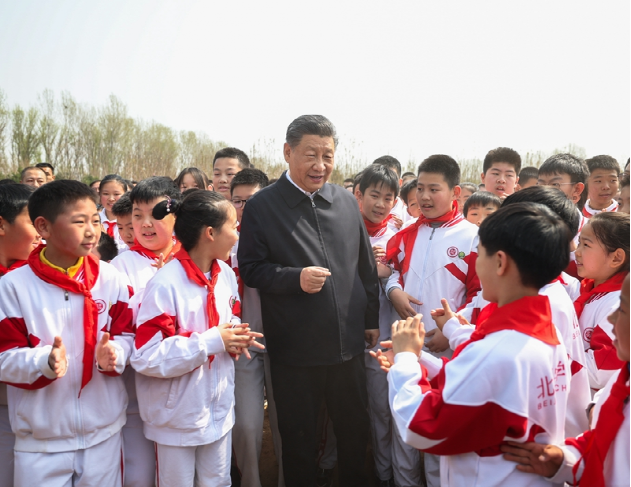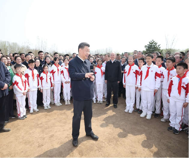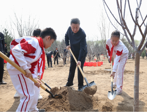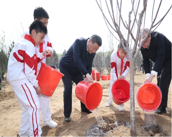 4月3日,党和国家领导人习近平、李强、赵乐际、王沪宁、蔡奇、丁薛祥、李希、韩正等来到北京市通州区潞城镇参加首都义务植树活动。这是习近平同少先队员一起给刚栽下的树苗浇水。新华社记者 鞠鹏 摄 挥锹铲土、培土围堰、提水浇灌……习近平接连种下油松、黄栌、元宝枫、樱桃、红叶碧桃、侧柏等多棵树苗。习近平一边植树,一边询问孩子们的学习生活、劳动锻炼情况。他强调,广大青少年是祖国的 未来,从小要积极参加劳动、植树造林,把绿色的种子种进心里,养成尊重自然、热爱自然的意识,勤奋学习、锻炼身体、茁壮成长,德智体美劳全面发展,努力成为国家栋梁。植树现场一派热火朝天的劳动景象,领导同志们同大家一起培土浇水,气氛热烈。
