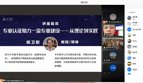 为促进我校一流本科专业建设,推动专业认证,提高我校教师的科研水平,增加学生的知识面,西昌学院经济管理学院于2020年10月27日14:00在腾讯会议组织举办了“专业认证助力专业建设-从理论到实践”专题讲座。本次讲座由经济管理学院副院长李思副教授主持,西昌学院教务处处长边世英教授、经济管理学院全体教师和部分学生聆听了本次讲座。