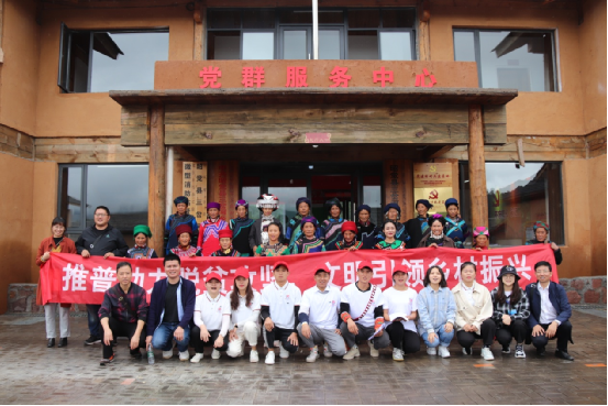 推普助力脱贫活动与会人员在三合村党群服务中心前合影