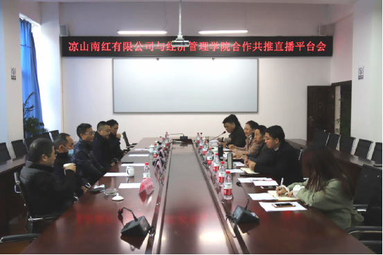 2020年12月14日上午10:00,经济管理学院与凉山南红有限公司于经济管理学院会议室就合作共推直播平台事项进行商议。莅临本次会议的嘉宾有:凉山南红有限公司董事长杨斌、凉山工投集团再生资源利用公司董事长喻华、凉山南红有限公司副总杨永生以及公司职员刘俊。同时,经济管理学院党委书记肖立新,经济管理学院副院长陆铭宁,经济管理学院副院长李思,经济管理学院党委副书记汪腾,经济管理学院电子商务专业负责人赵振君,教务科副科长郭娟,办公室副主任沙蓉以及刘财富老师也参加了此次会议。本次会议由经济管理学院副院长李思主持。