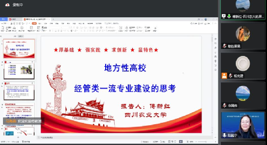 4. 傅新红教授以“地方性高校经管类一流专业建设的思考”为题,主要从“做优培养方案”、“做强师资队伍”、“做精课程建设”、“做深实践教学”、“做好第二课堂”、“做实质量管理”六个方面对地方性高校经管类专业建设提供了针对性的分析建议。傅教授强调,因学校不同、地理区位不同、基础不同、师资和教学条件不同,不同层次的国家一流专业建设具体标准各有不同,重点是需要扬长补短,做出特色,特色就是质量,特色就是竞争力,在今后的专业建设发展中要找好抓手,重点挖掘好学校特色与区域特色。