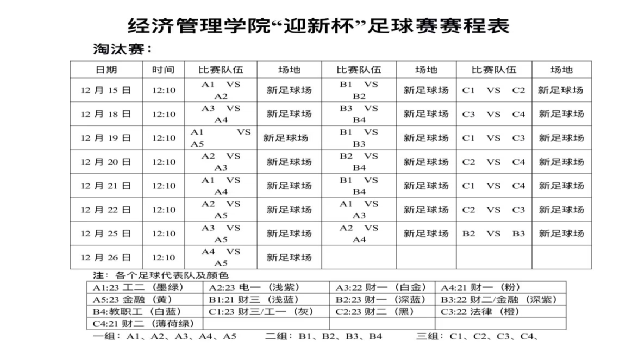 本次比赛赛时近一个月,由经管院12个班、1支教工队组成参赛队伍,比赛通过抽签方式采取544结构,分为A、B、C三组,A组5支球队,B组4支球队,C组4支球队,由各班代表抽签决定分组情况和比赛先后。