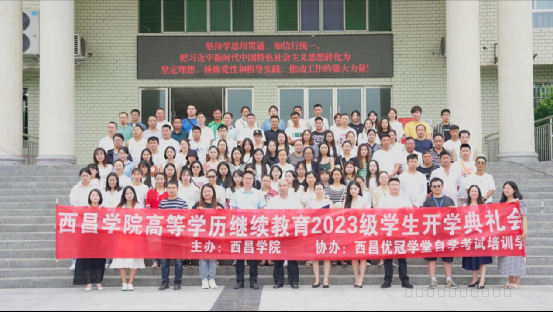 2023年7月30日上午,西昌学院高等学历继续教育2023级新生开学典礼在西昌学院安宁校区致知楼环形学术报告厅顺利举行。西昌学院继续教育学院院长涂勇、副院长王福明、办公室主任邓明英、教务科科长邓鹏,西昌优冠学堂自学考试培训学校校长陈鑫仪、教务主任付文翔、招生办主任晋苏、办公室主任张苡以及西昌学院高等学历继续教育2023级100余位新生代表参加了本次开学典礼。