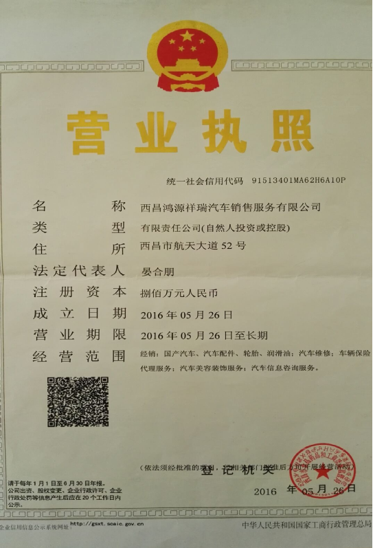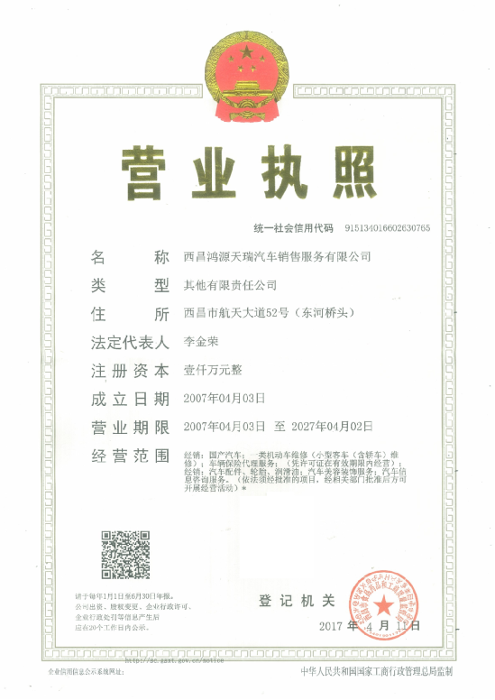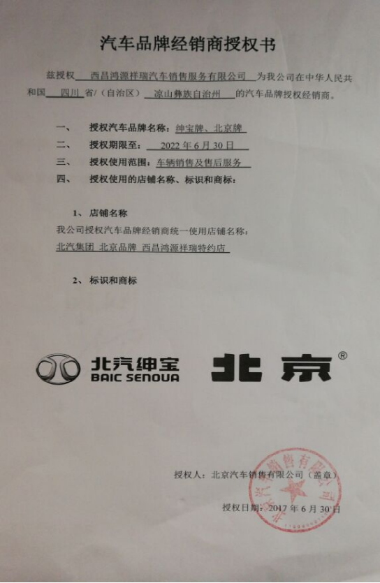 西昌鸿源天瑞汽车销售服务有限公司是一家集汽车销售、维修服务,配件供应、汽车装饰美容、汽车保险等服务于一体的汽车多元化企业,为形成全方位、多角度、高效、快捷、优质的服务,公司还成立了子公司(西昌鸿源祥瑞汽车销售服务有限公司,为北京汽车、北汽绅宝品牌4S店)和二级维修网点7家,分布在会理县、会东县、盐源县、冕宁县、越西县、雷波县、甘洛县,网点亦可同时为客户提供救急服务,我公司亦是凉山地区第一家标准4S店。