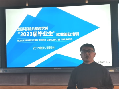 为更好地促进学院2023届毕业生的就业工作,11月17日上午,旅游与城乡规划学院在11教116教室组织召开“2023届毕业生”就业创业培训会议,并进行离校前集体合影。培训主要由旅游与城乡规划学院就业指导教师周峰主持,旅游与城乡规划学院副院长杨军、19级风景园林辅导员马燕、风景园林专业王海龙与黄哲玲老师及2023届风景园林专业全体毕业生参加会议。
