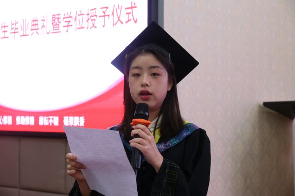 毕业生代表杨雨欣同学在发言中说,感谢学校对我们的辛勤培育,感谢老师们的循循善诱,感谢同窗们的贴心相伴,她说自己将带着西院四年独特的美好记忆,坚定地迈向崭新的明天。