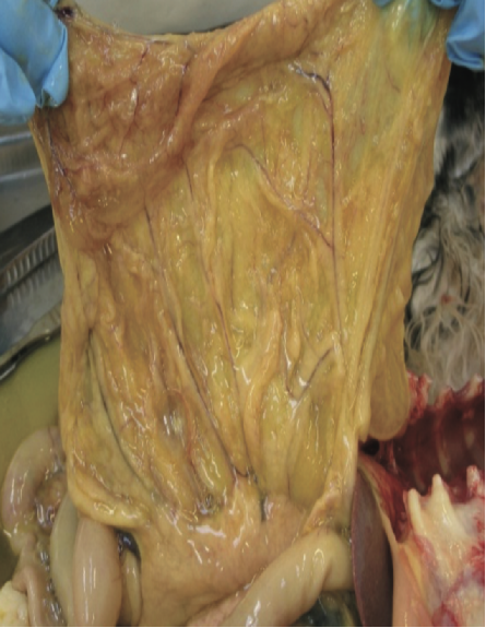 图2 .FIP病例典型的大体尸检结果。腹腔或胸腔内可见器官肉芽肿性病变或器官浆膜上的纤维素性斑块;适合检查的组织有肠系膜淋巴结、肝、脾、肾和肠表面,以及腹壁和膈肌的腹膜内层。在渗出性病例中,可以在胸膜腔和/或腹膜腔中看到黄色粘稠液体,但也可以检查心包是否有液体。