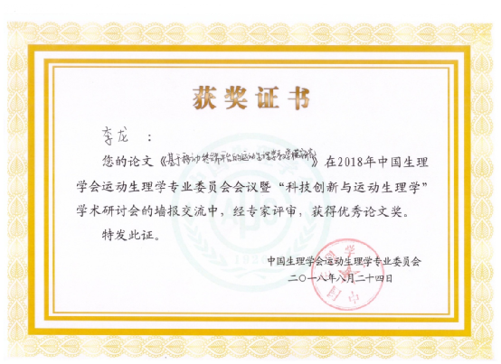 24日中午墙报交流期间,积极向参会评委专家交流请教,从基于移动终端平台的运动生理学理论和实验教学两个方面进行深入的阐释和构想,论文研究思路和研究方向得到了参会评委的积极认可。经过严格严谨公平公开的评审,论文获得墙报交流优秀奖。