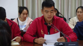 2019国际乒联女子世界杯志愿者工作学生负责人邓宇岑同学、志愿者杨燚同学等在发言中总结了成绩、指出了扑向的不足,对以后开展志愿服务工作提出宝贵的建议。