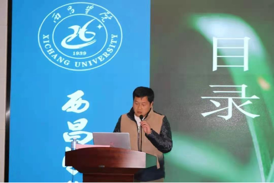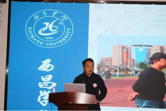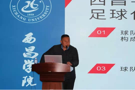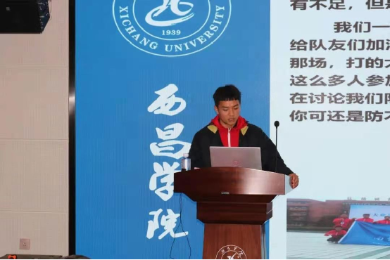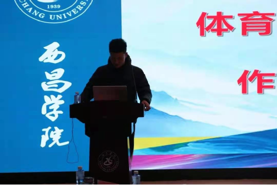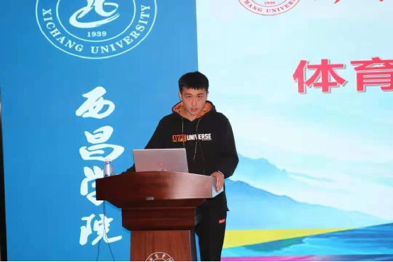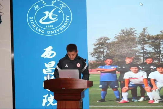 体育学院足球代表队男足主教练胡松涛老师展示了队员的日常的专项训练与对外交流学习得出的经验,由于疫情而推迟了“贡嘎杯”,但仍以“三从一大”为原则坚持一周一赛的对抗训练,最后送给各代表队“宝剑锋从磨砺出,梅花香自苦寒来”的心得!
