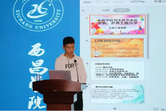 羽毛球代表队队长分享了球队训练的风采,针对日常训练提出问题与解决方法,最后祝福体育学院的体育能更光彩。