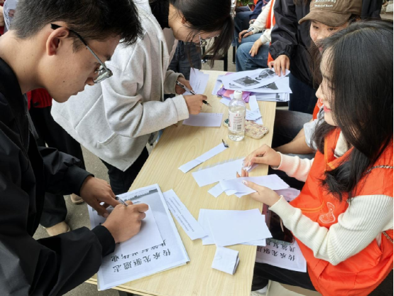活动伊始,志愿者们在弘毅楼大厅集合。随后,工作人员讲解活动注意事项,并带领志愿者有序到达活动场地。活动过程中,志愿者通过看图猜人物、知识答题两种活动形式向同学们宣讲辛亥革命的相关知识,并给优秀参与者发放小礼品。活动结束后,志愿者们认真做好善后工作,及时清理场地,归还物资。