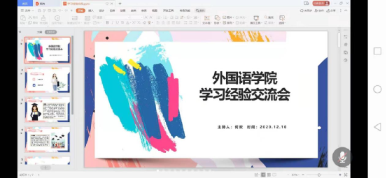 外国语学院开展线上学习经验交流会为了让我院学生对大学生活规划有一个清晰的认识,提高同学们的学习自主性,进一步促进我院的学风建设。2020年12月10日晚上19:00-21:00外国语学院开展了线上学习经验交流会,邀请西南科技大学外国语学院优秀学生代表孔婷和我院18级英语2班王镠灏同学,通过腾讯会议为我院全体学生作学习经验分享,经验交流会由何欢老师主持。