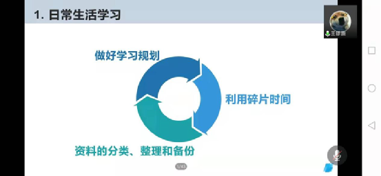 王镠灏同学从专业知识学习、日常生活学习、学习资源推荐、学习方法创新四个方面进行了经验分享。他重点介绍了自己对专业知识的学习途径,强调合理利用学习资源的重要性,并向大家推荐了一些实用的学习资源。