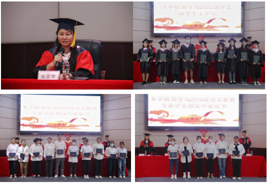 在学位授予仪式上,老师们为2022届王敏等66位同学颁发艺术学学士学位证,为张五散等335名同学颁发文学学士学位证,并为2019级语文教育专业同学颁发毕业证书。最后由张富翠副院长作总结发言,她希望大家奋力拼搏,并祝愿毕业生们在新的人生道路上事业有成、一帆风顺。