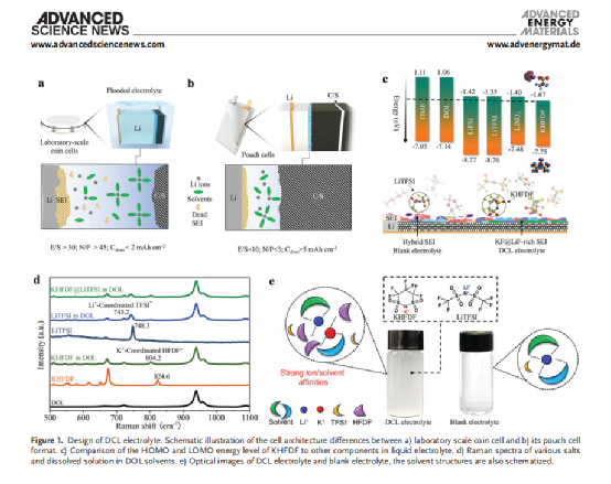 该研究从分子轨道能级理论出发,利用1,1,2,2,3,3-六氟丙烷-1,3-二磺酰亚胺钾盐较低的LUMO能级,设计出1,1,2,2,3,3-六氟丙烷-1,3-二磺酰亚胺钾盐耦合双三氟甲磺酰胺锂盐的双盐电解液体系,实现了对固态电解质膜(SEI)内部无机盐的定向调控,构建出LiF耦合KF的无机阻挡层,减缓了溶剂分子从锂金属表面获得电子的速率,从而降低了电解液在循环过程中的快速消耗。基于该电解液体系设计,所制备的锂硫软包电池循环稳定性由几十圈(~40)循环突破至200多个循环,显示出巨大的商业化潜力。