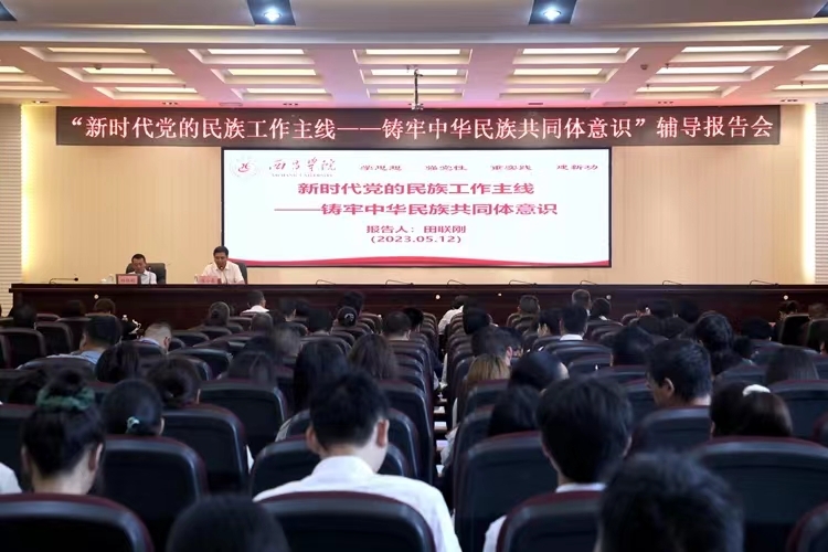 田联刚以《新时代党的民族工作主线——铸牢中华民族共同体意识》为题,从历史的必然性、现实的必要性、未来的必须性三个方面阐释了铸牢中华民族共同体意识的重要性;从各民族牢固树立休戚与共、荣辱与共、生死与共、命运与共的共同体理念,树立正确的祖国观、民族观、文化观、历史观构筑共有精神家园,从增进对伟大祖国、中华民族、中华文化、中国共产党、中国特色社会主义的认同等方面诠释了中华民族共同体意识;从加强思想引领、经济建设、教育引导、以领导干部和青少年为重点等方面为铸牢中华民族共同体意识指明了方向。