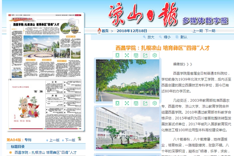 为积极推进教育教学改革,推进应用型本科学校建设,西昌学院注重实践技能的培养,推进产教融合校企合作,创立并实践“本科学历(学位)+职业技能素养”人才培养模式,力促学校发展,从今(17)日起,本报将连续5天推出“激活民族地区教育一泓水——来自西昌学院的系列报道”。