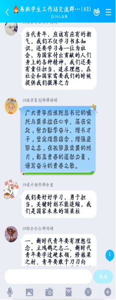 习近平总书记给北京大学援鄂医疗队全体“90后”党员回信 3月31日,西昌学院易班学生工作站通过QQ群+到梦空间组织开展学习讨论活动,学习贯彻习近平总书记给北大援鄂医疗队“90后”党员重要回信精神,切实把习近平总书记的重要回信精神转化为扎实行动。   易班工作站成员感想 看了习近平总书记15日给北京大学援鄂医疗队“90后”党员的回信,感受到这场疫情不仅是对医疗人员的考验,更是对广大青年的考验!同时我很庆幸我们能生于如此强大的一个国家,感受到我们国家的社会主义制度的优越性,作为当代大学生,应该不断向先辈们学习,勇于承担责任,做好时代青年! ——18网络客服部 杨春华 在这场人民战“疫”中,广大青年用实际行动充分证明,他们是有远大理想的一代,是有家国情怀的一代,更是能担当大任的一代!而我作为青年中的一员,坚信经过抗“疫”战火淬炼的中国青年,一定能不惧风雨、勇挑重担,在党和人民最需要的地方绽放出更加绚丽的青春光芒! ——19网络客服部 钟雯婷 要树立共产主义远大理想和中国特色社会主义共同理想,增强中国特色社会主义道路自信、理论自信、制度自信、文化自信,立志肩负起民族复兴的时代重任。 ——19编辑宣传部 凌波兰 作为生活在新时期的青年一代,要有一股遇到任何事情都勇于挑战的勇气,处难不惊,克难而进,勇于担当这个时代赋予的历史责任,励志勤学、刻苦磨练。 ——19运营策划部 陈翠霖 青年是祖国未来的栋梁和希望,所以作为新青年的我们应该有理想有担当有责任心,我们应该不忘初心,砥砺前行。 ——19运营策划部 刘金梅 当代青年,应该有应有的朝气,我们不仅学习书本知识,还要学习每一位为社会,为国家付出贡献的人们身上的各种精神,我们还要有责任担当,追求理想,在社会和国家需要我们的时候提供我们微薄之力。 ——19综合办公部 罗思雨 青年是时代的未来 ,肩负着历史的重担,我们应该将习近平总书记的嘱托与要求铭记于心,刻苦奋斗,不断增强自己的专业才识,做一个有理想有担当的时代新青年。 ——19运营策划部 谭婷婷 我们要好好学习,勇于担当,关键时刻不能退缩,我们是国家未来的顶梁柱。 ——19设计制作部 余慧 作为大学生我们要有理想,有目标,努力学习,积极向上,向疫战中的战士们学习。 ——19编辑宣传部 李玉 青年人是祖国的未来和民族的希望,青年一代有理想、有本领、有担当,国家就有前途,民族就有希望。青年人要勇担大任,把社会主义核心价值观牢记在心中,为中国的伟大复兴而奋斗。坚定“四个自信”,爱国主义为核心的民族精神。在社会发展中发挥作用、勇敢担当、奉献青春、实现价值。扎根在社会的各个地方,乐于奉献。要不忘初心、不负韶华、继续奋斗。 ——19网络客服部 周希雅 要树立崇高的理想,牢记使命,勇于担当,关键时刻不退缩。好好学习。 ——19编辑宣传部 赵雯 我们是新青年,我们是党和社会主义各项事业的接班人。当代大学生要承担起强国、富国的历史使命。我们是新青年,要有承担责任的勇气与魄力,我们要不畏艰难与险阻,勇往直前,不怕困难与挑战,继往开来。 ——19设计制作部 陈国莉 作为大学生,我们要完善并发展自己,努力地去提高自身价值,紧跟随社会的发展趋势,培养自己对所学习专业的热情,树立正确的人生观与价值观。 ——19运营策划部 阴小霜 作为当代青年我们要树立崇高的理想。我们要有不惧艰难的精神,就如习近平总书记所说青年一代有理想,有本领,有担当国家就有前途,民族就有希望。所以作为当代大学生我们应当努力学好专业知识,为国家的繁荣贡献自己的一份力量。 ——18网络客服部 韩小丽 一代人有一代人的使命担当。这些90后的哥哥姐姐们在这次武汉战疫中奋勇向前,我们00后在今后的日子里也要努力拼搏,不输前人。牢记自己使命,做一个有理想,有信念的当代青年。 ——19网络客服部 张雨蝶 作为当代新青年,我们是国家的希望,我们要继承前辈们的优点,对后面的人起好带头作用,我们要把习近平总书记的话放在心上,积极学习,应用学到的知识完善自己。帮助他人,为社会做贡献。 ——18编辑宣传部 邓雨蝶 作为新时代的青年,我们要勇担时代使命。作为新时代的主力军,我们更应该严格要求自己,竭尽全力去提升自我能力,正所谓少年强则国强,在这次疫情中我们看到了90后、00后的担当。他们的行为激励着我们,我们要努力完善自己的能力,做好新时代的接班人。 ——18编辑宣传部 陈淑敏 当代青年,应该有应有的朝气,我们不仅学习书本知识,还要学习每一位为社会,为国家付出贡献的人们身上的各种精神,我们还要有责任担当,追求理想,在社会和国家需要我们的时候提供我们微薄之力。 ——19编辑宣传部 吴美琳 作为新时代的青年,我们要从现在做起,从自己做起,脚踏实地,认真的学习专业知识,在德智体美劳方面全面发展,成为未来的社会栋梁,发展中国。我们更应该了解当前的社会,了解国家实事,将祖国铭刻于心。 ——19网络客服部 陈雅倩 作为新时代青年应该时刻关注国家大事,努力学好专业课,将来可以运用到社会,且奉献自己一份力量. ——19设计制作部 李林霞 青年一代有理想,有担当,有抱负,国家就有希望,有未来,我们作为新时代的青年,不管是在学习生活,亦或是重大危难面前,更应该发扬出青年人