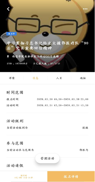 西昌学院易班全体同学学习贯彻习近平总书记给北大援鄂医疗队“90后”党员重要回信精神活动总结 3月15日,习近平总书记给北京大学援鄂医疗队全体“90后”党员回信,向奋斗在疫情防控各条战线上的广大青年致以诚挚的问候,勉励广大青年不惧风雨、勇挑重担,让青春在党和人民最需要的地方绽放绚丽之花。