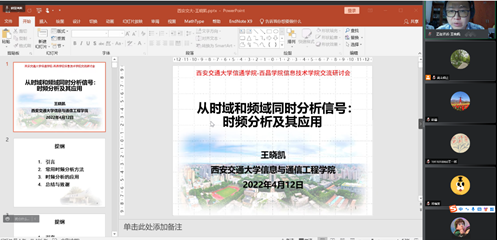 信息技术学院于2022年04月12日晚邀请西安交通大学电信学部信息与通信工程学院副教授王晓凯在腾讯视频会议上开展了“从时域和频域同时分析信号:时频分析及其应用”讲座,近百名师生听了此次讲座。