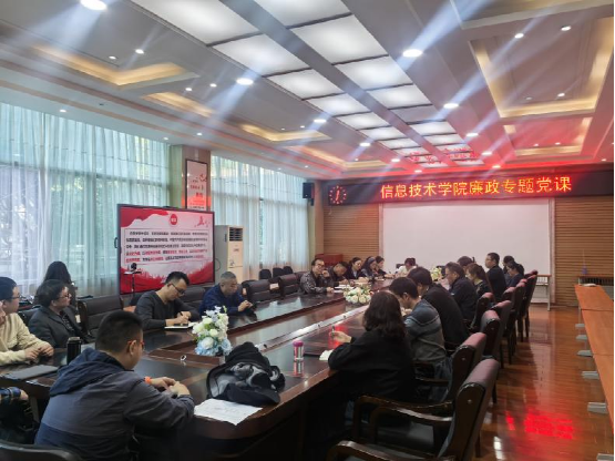 为进一步落实党风廉政建设的相关要求,引导教师增强廉洁自律意识,筑牢思想防线,2025年11月7日,信息技术学院党委组织全体教职工党员在致远楼会议室开展了“溯廉洁文化之源 学中央八项规定精神之要义 筑高校师德师风之基”专题党课。此次党课由学院党委副书记、院长曾陈萍主讲,旨在引导广大党员教师从中华优秀传统文化中汲取廉洁养分,深刻领会中央八项规定精神的核心要义,筑牢新时代高校师德师风建设的思想根基。