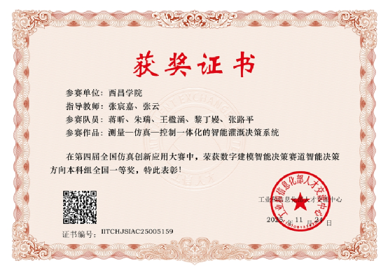 近日,在四川大学举办的2025年全国仿真创新应用大赛总决赛中,信息技术学院、资源与环境学院联合组建的“智慧灌溉创新创业”团队,凭借“测量—仿真—控制一体化的智能灌溉决策系统”项目,从全国众多高校、企业中脱颖而出,荣获数字建模与智能决策赛道一等奖。展现了学院在智能农业与仿真技术融合领域的创新实力。