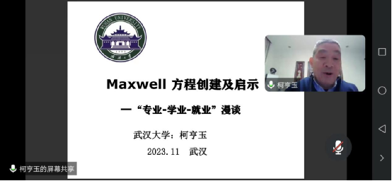 2023年12月6日信息技术学院线上长期银龄教师武汉大学柯享玉教授为2023级电子信息工程专业学生做主题为“Maxwell方程的启示一一学业、就业与创业漫谈”专题讲座。