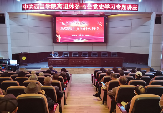 为迎接中国共产党建党100周年,在西昌学院离退休职工中掀起热爱中国共产党、拥护中国特色社会主义制度、学习马克思主义的热潮。中共西昌学院离退休委员会举办了“党史学习专题讲座”。 4月8日上午,“党史学习专题讲座”在西昌学院南校区学术报告厅召开。此次讲座由马克思主义学院教授、教务科科长、西昌学院“凉山红色文化资源与思想政治教育研究中心”主任黄信教授主讲,离退休党委全体党员及在职工作人员共计64人次参加此次讲座。