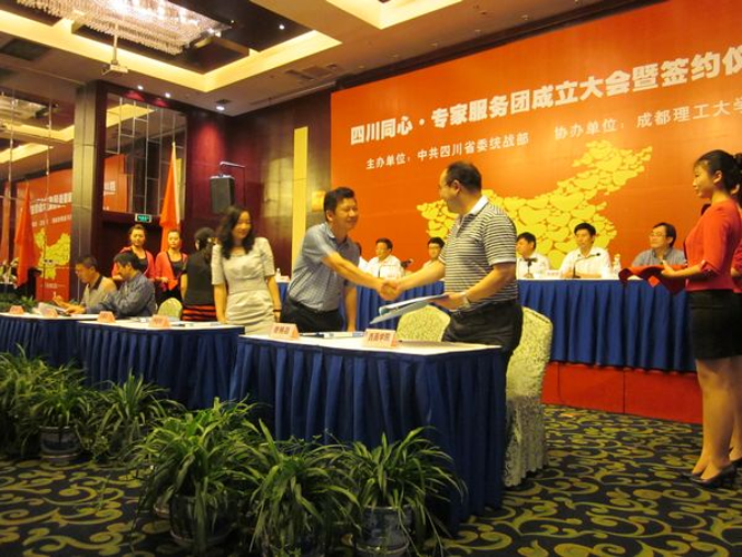 在会上,省委常委、秘书长、统战部长陈光志作重要讲话并为四川同心·专家服务团授旗,省委教育工委书记朱世宏发言,省委统战部常务副部长尧斯丹宣布《关于成立四川同心·专家服务团的决定》。成都理工大学党委书记谭书敏致欢迎词,参会领导为四川同心·专家服务团各分团授牌并颁发专家聘书,专家服务团代表与受援方代表签订了合作协议。专家、高校和受援方代表分别发言。 .png)
