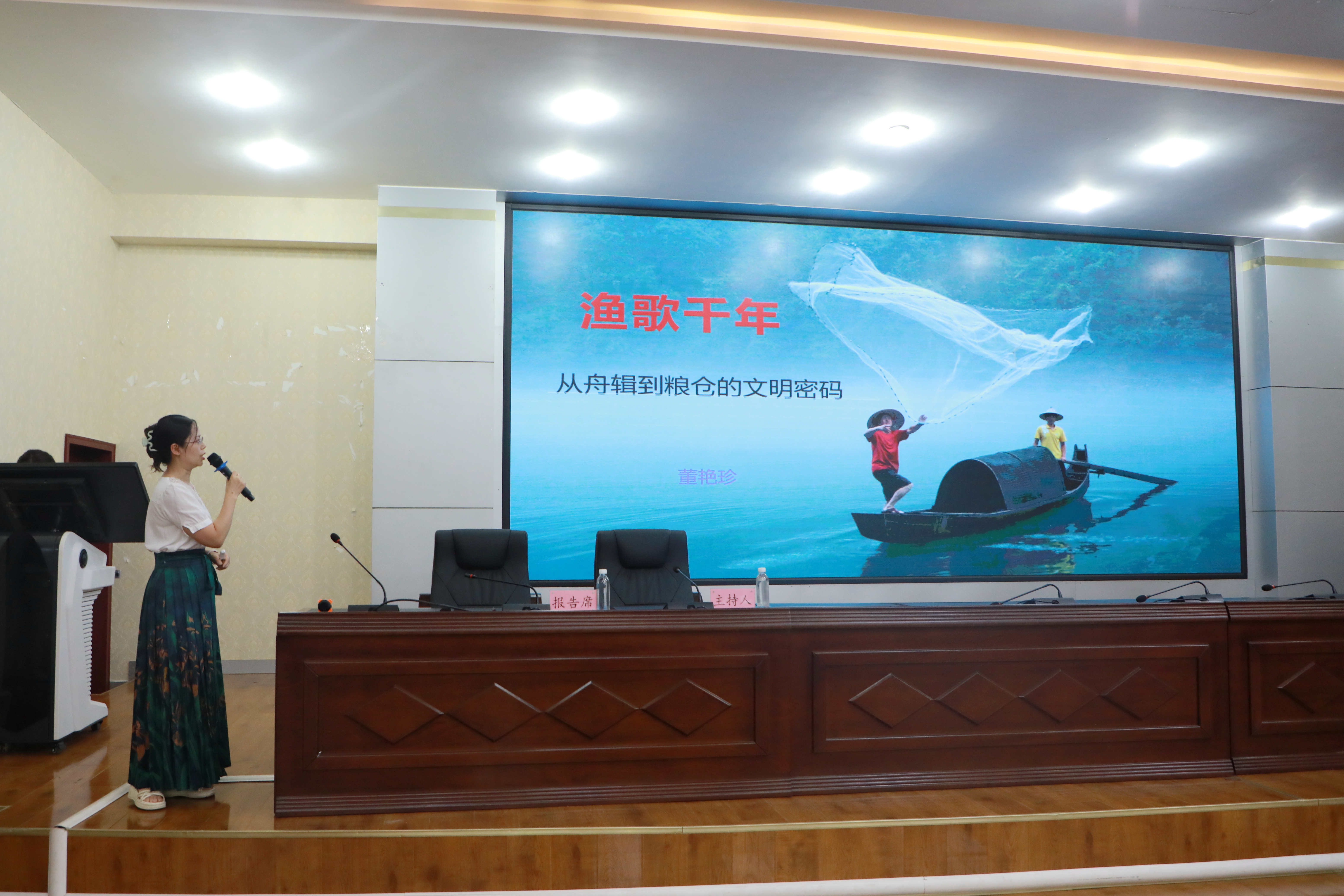 本次同心大讲堂讲座由民盟西昌学院基层委员会副主委董艳珍老师主讲,以《渔歌千年:从舟楫到粮仓的文明密码》为题作报告,带我们穿越历史长河,探寻渔业文明背后的文化脉络与发展智慧。